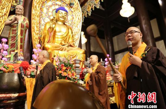 在吉祥钟亭,南山寺达定法师带领僧众举行撞钟祈福仪式。达定法师引领游客从1到108按顺序撞响辞旧迎新的吉祥钟。