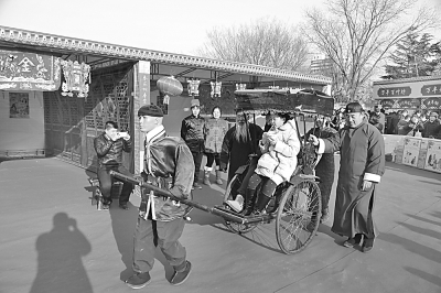 2016北京春节“洋庙会”在石景山游乐园开幕,“老北京记忆”成为该庙会一大亮点。传统的京味特色小吃、老物件展、非遗展演等特色活动,唤起了北京人的乡愁,也让年轻人和外来游客更好地了解北京的历史及民俗文化。图为游客亲身体验老北京“拉洋车”。本报记者 董城摄