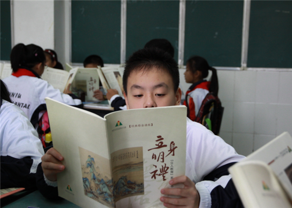 开展国学经典教育活动,制定国学经典教育的实施计划,确保国学经典教育进课程、进课堂,并实现满覆盖。针对不同学段学生特点,设定不同的国学经典学习内容。在幼儿园阶段,诵读《三字经》,选读古诗、童谣等;高中1至2年级则通读《老子》、《世说新语》、《增广贤文》,能结合当代价值观,对其中的部分内容提出自己的评价。