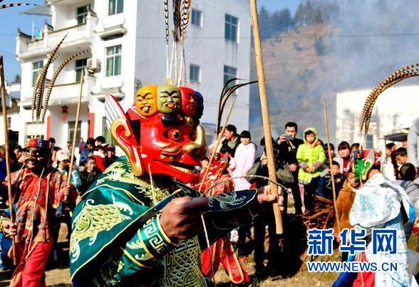 2月9日,乡村艺人在江西省婺源县秋口镇长径村表演跳傩舞。当日是大年初二,江西省婺源县秋口镇长径村表演请傩神、跳傩舞的傩事活动,吸引了众多乡亲和游客观看。婺源傩舞俗称“鬼舞”或“舞鬼”,极具地域特色,早在明代初叶就有记载。每逢新春,当地都会请傩神、跳傩舞,祈盼风调雨顺、五谷丰登。 新华社发(胡敦煌 摄)