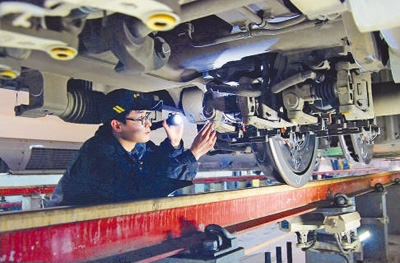 春运期间,武汉铁路局武汉动车段地勤机械师挑灯夜战,确保动车组零故障运行,让旅客安全过年。图为地勤机械师正在进行库外保温作业。