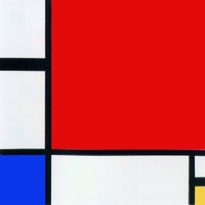 1920年,在舍恩迈克斯学说的影响下,蒙德里安创作了抽象绘画《构成A》。画面上,他只用水平线和垂直线作为基本构成元素,色彩则仅用三个原色加上黑、白、灰,空间结构完全平面化。接下来,他完成了另一件更为重要的作品《黑、红、灰、黄和蓝色的构成》,在这幅堪称蒙德里安标志性的创作中,线条与色块更为简洁,红、黄、蓝每种原色只出现一次,所有元素都被缩减到了最少、最纯粹的程度。他还特意在作品的背面写下了“绘画一号”,认为这件作品完美地实现了自己的美学理想。