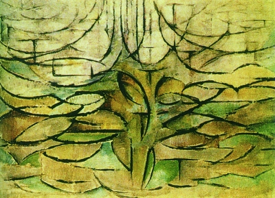 1911年10月,已年近40岁的蒙德里安,第一次看到了毕加索和布拉克的立体主义画作,立即受到强烈震撼。几个月后,他来到巴黎,一边研究一边尝试立体主义的绘画风格与技法,先后创作了《静物与姜罐Ⅰ》和《静物与姜罐Ⅱ》,两幅画面的构图色彩虽很接近,但第一幅还保有物象的具体轮廓和三度透视空间,后一幅则几乎平面化,物体的形象变成了基本的线条和几何形,色彩也简化到极少。如果说第一幅还有塞尚影响的痕迹,后一幅则明显倾向了毕加索的分析立体主义。从这两幅作品的演变中,可以看到蒙德里安在立体派的解析精简的启发下,表现形式逐步摆脱了常规的束缚。