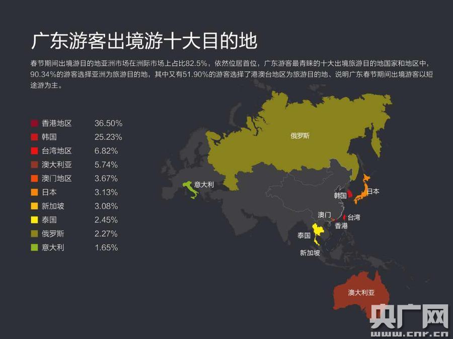 央广网广州2月15日消息(记者郑澍)广东省旅游局15日发布2016年春节广东旅游大数据报告,据统计,春节期间累计接待游客总人数4252.18万人次、同比增长10.23%,其中过夜游客1062.33万人次、增长12.5%,一日游游客3189.84万人次、增长9.5%;实现旅游总收入315.4亿元,增长14.3%。根据报告,深圳、广州依然是最受外地游客欢迎的两大热门城市,游客接待量超过广东一半,其中春节期间香港来的游客占到总数量的26.2%,76.55%以上都通过深圳入境。 据悉,春节期间亲朋好友结伴出行成为最大热门,同时适合家庭出游的主题公园和春节祈福类景区也深受游客欢迎,纯观光类景区遇冷。来粤游客居前的省份主要是广东周边省份,说明黄金周期间外地游客的主要旅游方式为春节之后的短线出游,其中高铁占公共交通出行的60.49%,说明高铁对广东旅游带动作用明显。来粤游客的旅游类APP的使用高峰分别出现在2月9日和2月11日,其中2月9日主要为酒店住宿和景区门票预订,2月11日主要为返程类预订,说明春节期间旅游以三日游为主。 从游客出行来看,排除春节之前两天的回乡客流,春节出游从初一开始增长,并在初四达到出游的高峰。春节期间,来粤游客住宿类APP使用最多,游客先确定住宿地点再在行程中查询景区门票和攻略确定游玩地点,说明观光游向休闲度假游转变趋势明显。 依据百度搜索统计分析,关注广东的游客中,学生和高收入群体各占一半,其中85后成为来粤游客的主体并逐渐成为休闲度假游的推动者。广西、江西、湖南、福建、香港等相邻区域为广东游客主要出游目的地,说明受春节以及春运因素的影响,广东游客更多选择以周边省份为目的地的短途旅游,并通过高铁或自驾游方式出行。 依据广东省旅游团队管理系统数据统计,春节期间广东出境游游客以近程目的地为主,亚洲市场在洲际市场上占比82.5%,依然位居首位,春节期间广东游客最青睐的十大出境旅游目的地国家和地区依次是:香港地区、韩国、台湾地区、澳大利亚、澳门地区、日本、新加坡、泰国、俄罗斯、意大利。前十个目的地游客中,90.34%选择亚洲为旅游目的地,其中又有51.90%的游客选择了港澳台地区为旅游目的地、说明广东春节期间出境游客以短途游为主。(央广网记者 郑澍 摄)