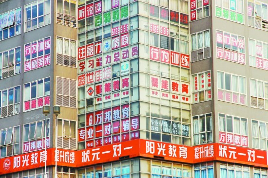 2015年5月26日,河南安阳市,一栋商业楼的窗户上挂满了辅导班的广告。视觉中国供图(资料图片)