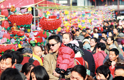 2月14日,江苏南京夫子庙花灯市场人山人海,众多市民现场观灯、买灯,共享新春的红火与喜悦。
