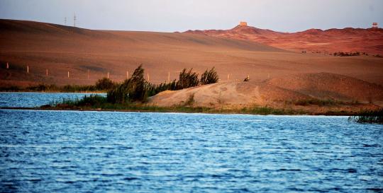 经过何延忠的“沙漠都江堰”治理后,一片湖泽出现在阳关脚下的沙漠之中