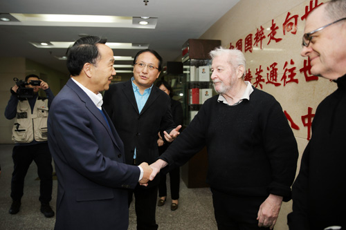 蒋建国一行在中国外文局局长周明伟等的陪同下,参观了局史展,详细了解中国外文局的发展历史、事业格局、业务情况等,听取了工作情况和发展思路的汇报,到外文出版社和今日中国杂志社参观并看望慰问了老专家、外国专家和干部职工代表,向大家致以新春佳节的亲切问候。