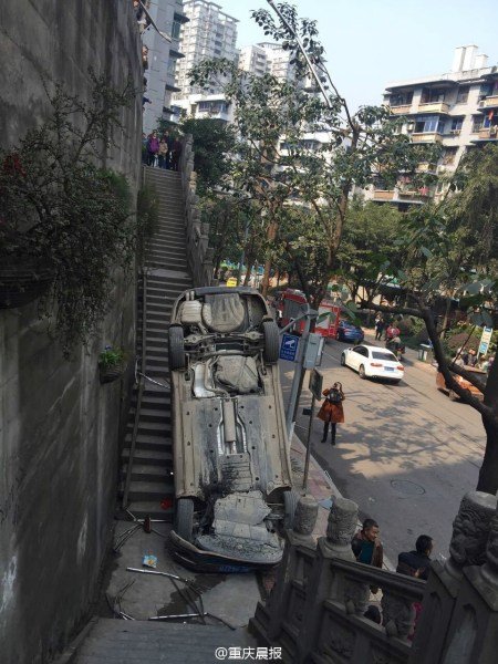 司机错挂倒档 车身冲破栏杆坠下4米高堡坎