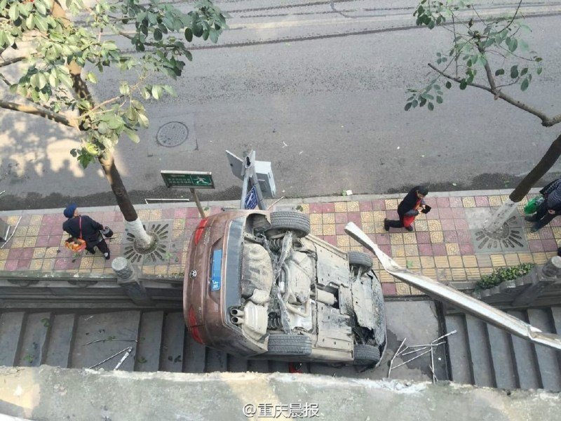 司机错挂倒档 车身冲破栏杆坠下4米高堡坎
