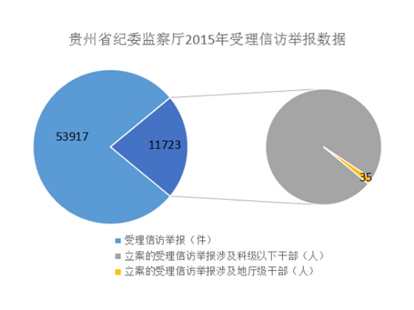严厉惩腐肃贪,零容忍拔“烂树”,2015年全省纪检监察机关共受理信访举报53917件,立案11723件,其中地厅级干部(省管企业负责人)35人,结案11136件,党政纪处分12239人,移送司法机关765人。(贵州省纪委)