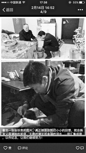 火烧坪乡党委书记李德兵告诉北青报记者,节后上班前,他陆续收到了机关干部们为父母洗脚的照片。2月14日,他在社交媒体称:“上班前夜,陆续收到同学们的寒假作业,看到一张张珍贵的图片,真正感受到我们小小的回馈,就会换来父母满脸的笑容、无限的满足和幸福的泪水。”