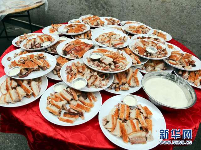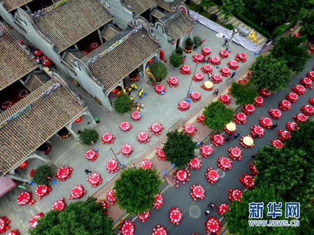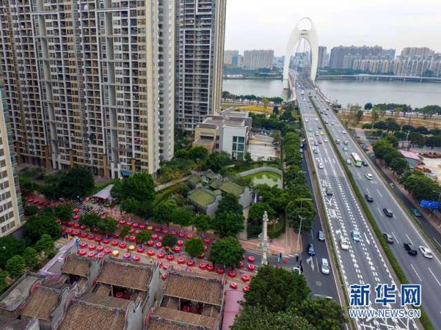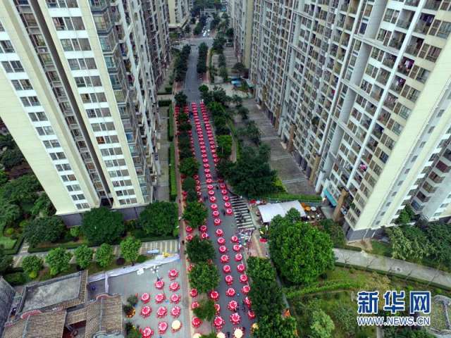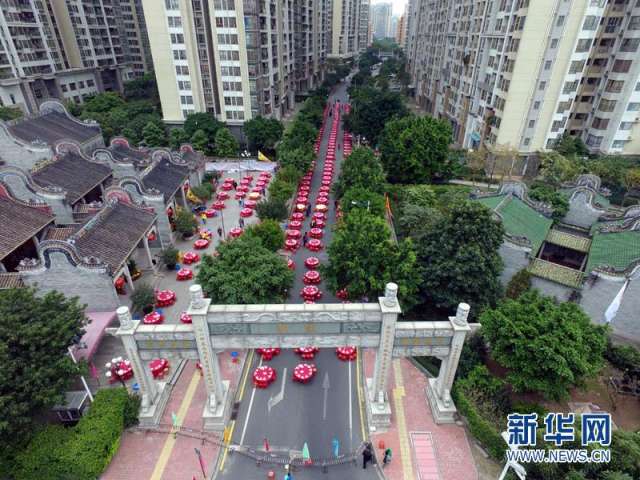 2月17日,在广州市天河区大街旁出现长长的流水席,从高空俯瞰就如同一条长长的“火龙”,场面热闹,吸引了不少市民驻足街头观望。这是猎德村一年一度的宗亲祠堂民俗活动。本次活动负责人之一、66岁梁叔对新华网广东频道表示,每年春节过后的大年初十,他们都会举办类似的宗亲庆典民俗活动。从2010年至今,他们已经连续六年举办民俗活动,今天的活动是猎德村的梁氏、麦氏和林氏联合摆下近300桌酒席,其中梁氏族人摆了230桌,已邀请村中近千人参与聚餐。梁叔表示,希望通过祠堂聚餐这一纽带,缅怀祖先的同时,保存岭南风俗文化特色,进而凝聚同姓人心。