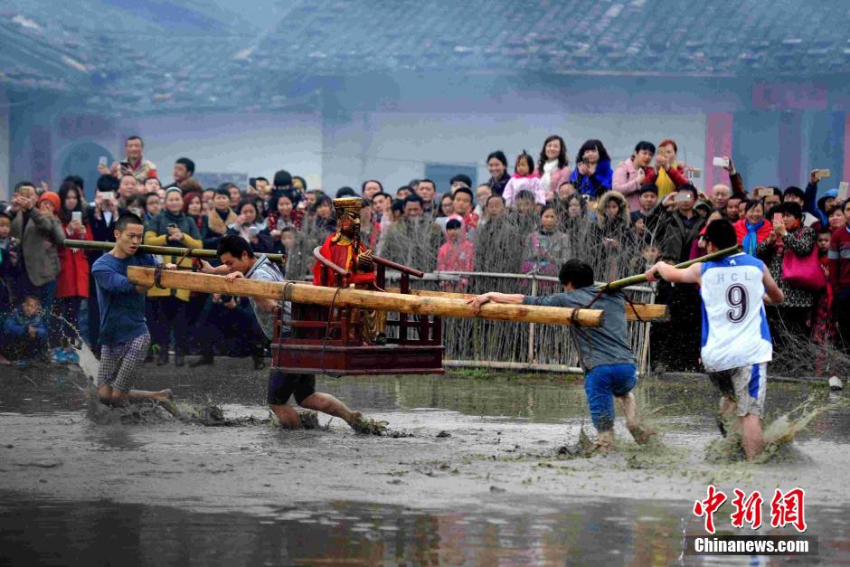 每年正月十二至十四日,福建长汀县童坊镇都会举行被称为“闹春田”的客家民俗活动。“闹春田”又称“甩泥巴”“走春泥”,有客家“乡村狂欢节”之称。作为当地一年一度的大型客家民俗活动,已有数百年历史,村民们抬着上百斤重的关公菩萨在泥田里奔跑、角力,以此来祈愿风调雨顺、五谷丰登,新年有个好收成。 张斌 摄