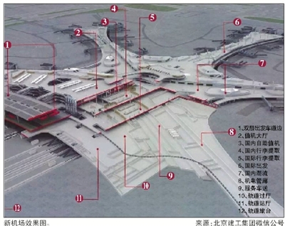 而北京建工集团中标的则是航站楼的另一大部分——“北京新机场旅客航站楼及综合换乘中心(指廊)工程”,即航站楼东北、东南、中南、西南、西北的五座指廊。总面积30万平方米,总造价32.7亿元。