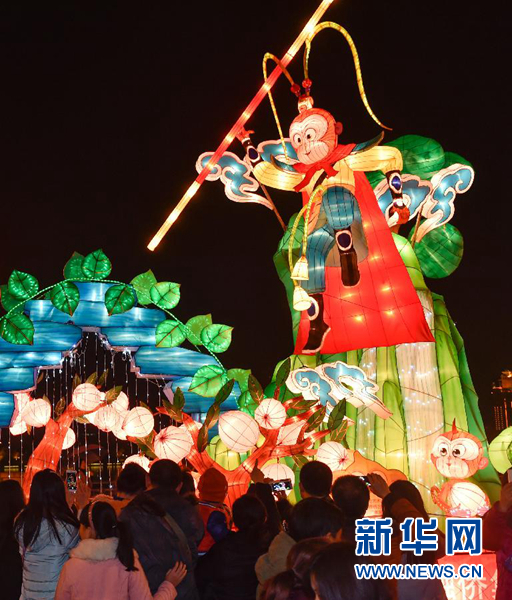 2月19日,市民和游客在福州元宵灯会上观赏大型灯组“灵猴献瑞”。元宵佳节将至,福建省福州市在闽江两岸举行元宵灯会。 新华社记者 宋为伟 摄