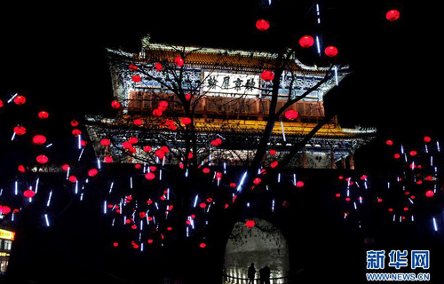 2月21日,游客在河北省张家口市宣化古城镇朔楼观赏夜景。当日,全国各地群众通过民俗表演、猜灯谜、做花灯等丰富多彩的方式,迎接即将到来的元宵佳节。 新华社记者 杨世尧 摄