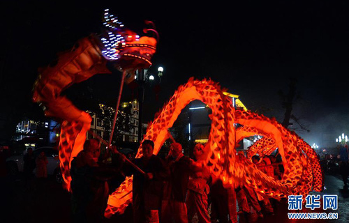 2月21日,江西省南昌市湾里区太平镇的农民舞起龙灯喜迎元宵佳节。当日,全国各地群众通过民俗表演、猜灯谜、做花灯等丰富多彩的方式,迎接即将到来的元宵佳节。 新华社记者 万象 摄