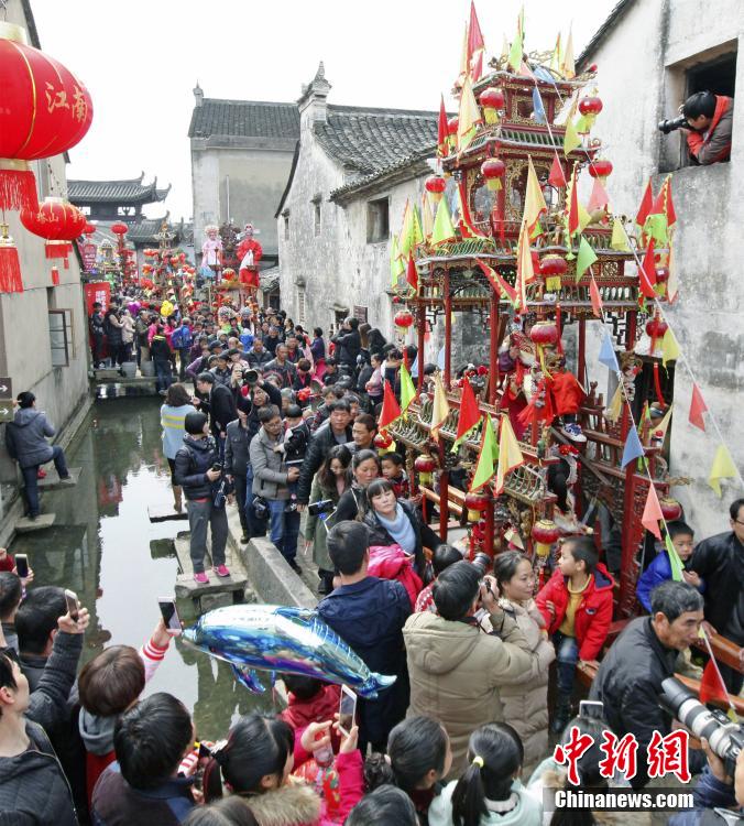 2月21日,在浙江省宁波市宁海县前童古镇,鞭炮声、锣鼓声、唢呐声此起彼伏,由前童镇四代童姓家族成员组成的行会表演队伍一路浩浩荡荡,走街穿巷,各杠鼓亭、抬阁、秋千则按房族大小依次排列,簇拥相随,这一具有“老底子”民俗年味的宁波前童元宵行会吸引了上万村民、游客驻足观看。