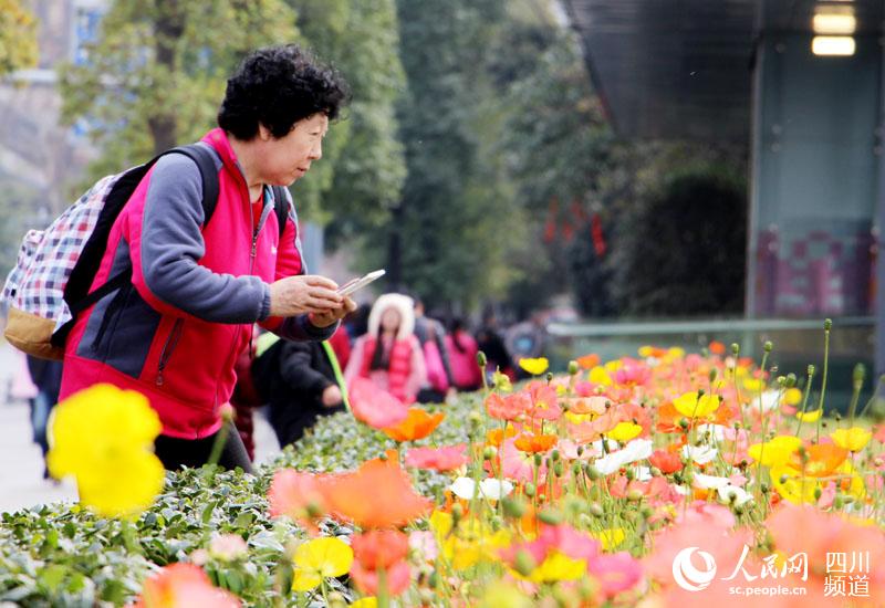 初春二月,乍暖还寒,正月十五,成都街头鲜花竞相开放,姹紫嫣红,引得市民纷纷驻足观赏拍照。(王波 实习生 周栩如)