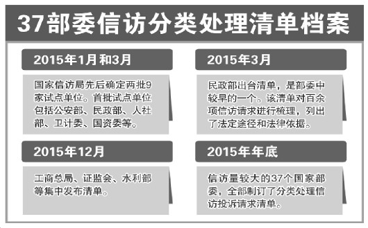 信访量较大的37家中央部委,在国家信访局的指导和推动下,于2015年底前,全部出台了“信访分类处理清单”。这个清单明确了哪些事项应该走诉讼渠道,哪些事项应该走复议渠道,哪些事项应该走仲裁渠道……目前,这项工作正在从部委向基层推进,市县是重点。