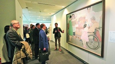 2月25日,中国第十二届全国美术展获奖优秀作品展在位于日本东京的日中友好会馆美术馆拉开帷幕。这场主题为“百花缭乱——中国现实主义的辉煌”的美术作品展汇集了76件在中国第十二届全国美术展上获奖的艺术精品,涵盖了国画、水彩画、油画、版画、漆画、雕刻、动漫等艺术门类,吸引了日本美术界的专家学者和大批美术爱好者前来观展。图为日本参观者在中国画作品《儿女情长》前驻足观看。
