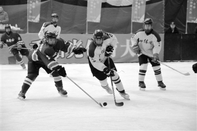 冰球已成为中小学生喜爱的时尚运动。图为学生们在比赛中激烈争抢。安灵均 摄