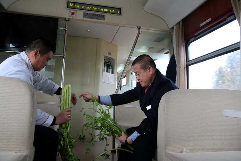 接班后,马杰开始和餐车工作人员一起择菜,准备旅客的盒饭和乘务餐。