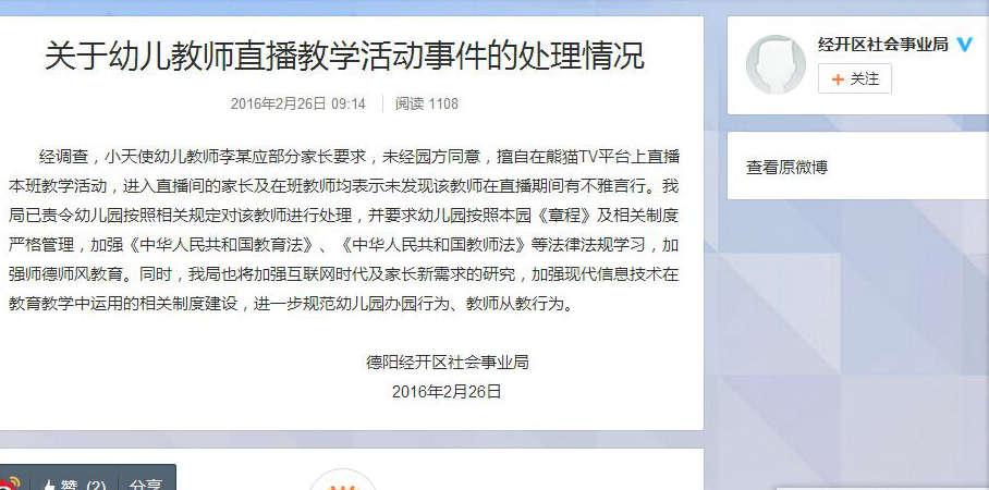 德阳经开区社会事业局称,经调查,小天使幼儿教师李某应部分家长要求,未经园方同意,擅自在熊猫TV平台上直播本班教学活动,进入直播间的家长及在班教师均表示未发现该教师在直播期间有不雅言行。