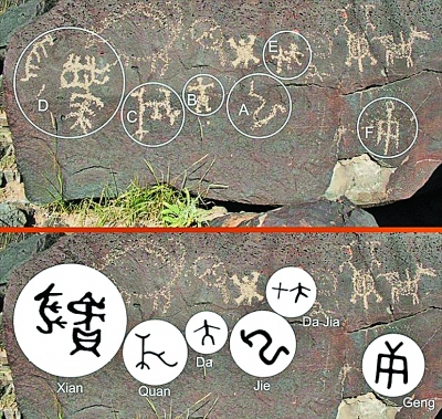 鲁斯坎普称在阿尔布开克市发现的岩壁画(下图)是中国商代末期使用的甲骨文,而这些甲骨文记载了进行宗教仪式的祭祀品,他推断这些祭祀品是献祭给殷商第三代王,音译为“大家”的。但是,据中国史料记载,商朝第三代王是商哀王外丙,姓子名胜,与“大家”相去甚远。鲁斯坎普还称,新墨西哥州部分岩壁画已经被证实是殷商甲骨文,不仅文字是甲骨文,其书写方式也效仿了中国古代从右向左的书写习惯。包括壁画上展现的祭祀品“狗”也是符合商周时期祭祀风格。