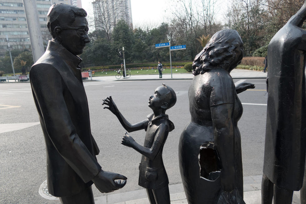 上海南京西路延安中路口一座“排队候车”的人物雕塑是申城都市生活的写照,可这座已近10年的雕塑如今破损严重。