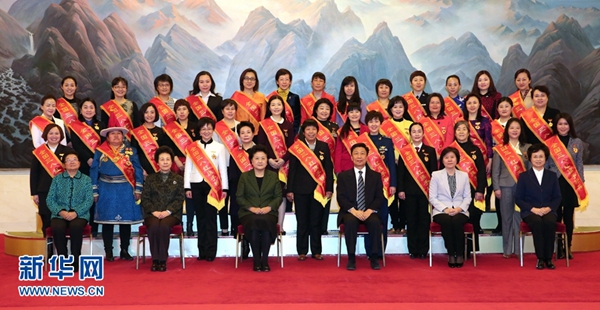 2月29日,纪念“三八”国际妇女节暨全国三八红旗手(集体)表彰大会在北京隆重举行。中共中央政治局委员、国务院副总理刘延东,中共中央政治局委员、国家副主席李源潮接见受表彰的先进代表。全国人大常委会副委员长、民进中央主席严隽琪出席大会,全国人大常委会副委员长、全国妇联主席沈跃跃讲话。这是刘延东、李源潮、严隽琪、沈跃跃等在大会前与全国三八红旗手标兵、全国三八红旗手代表、全国三八红旗集体代表合影。新华社记者 殷刚 摄