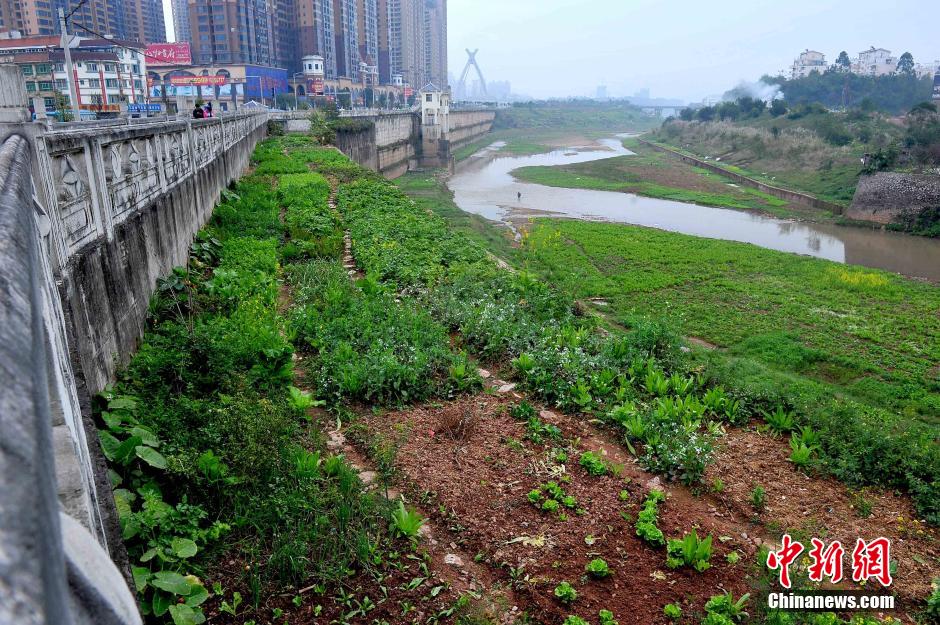 2月28日,广西壮族自治区南宁市良凤江河道中的河床与河堤空地,被人为开垦成一块块大小不一的私家菜地,上面种植着各种各样的蔬菜。这些私家菜地,不仅影响河道的水质,也会影响行洪。 中新社记者 胡雁 摄