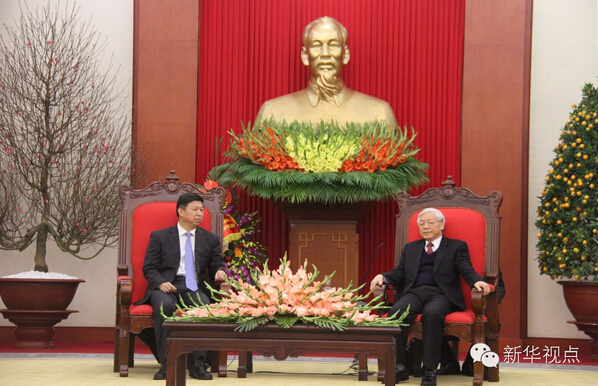 2016年1月29日,在越南河内,越南共产党中央总书记阮富仲(右)会见习近平总书记特使、中联部部长宋涛。宋涛向阮富仲转交习近平总书记的贺信并转达口信。新华社记者乐艳娜摄