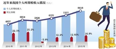 我国个人所得税收入已连续多年同比增长。财政部数据显示,2015年我国个人所得税收入为8618亿元,同比增长16.8%;2014年,个人所得税收入为7377亿元,同比增长12.9%;2013年,个人所得税收入为6531亿元,同比增长12.2%。
