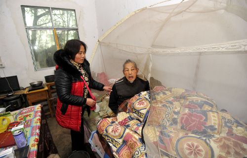 19日上午,下山桥小学院内的蒋国珍住处,记者还未走进卧室,就听到蒋老师沉重的呼吸声。他侧躺在床上,电热毯开着,精神萎靡不振,面色苍白浮肿。人民医院副院长万红梅走到蒋国珍老人身旁,询问他的身体情况。但是,蒋国珍表情迷糊,摇摇头,示意听不见。在身旁照料他的侄女蒋根英大声地用本地方言和蒋国珍重复万红梅的问题。蒋国珍试图回答,但是他嗓子沙哑,吐字不清,众人都无法辨别他在说什么。