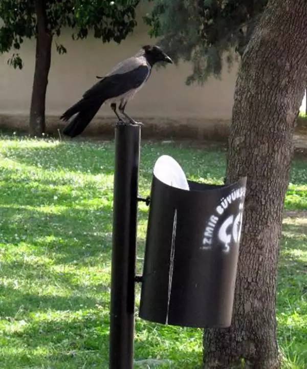 ▼这只乌鸦把它吃完的盘子随口叼去丢进垃圾桶了!