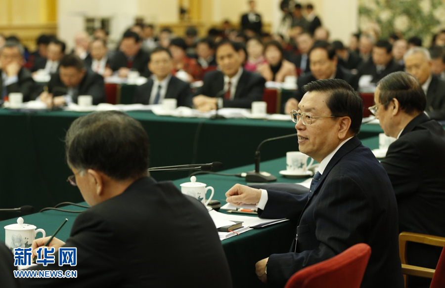 3月7日,中共中央政治局常委、全国人大常委会委员长张德江参加十二届全国人大四次会议安徽代表团的审议。 新华社记者鞠鹏摄