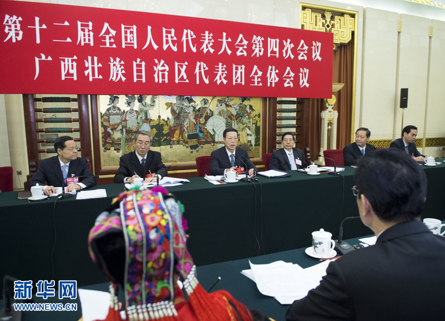 3月7日,中共中央政治局常委、国务院副总理张高丽参加十二届全国人大四次会议广西代表团的审议。 新华社记者王晔摄