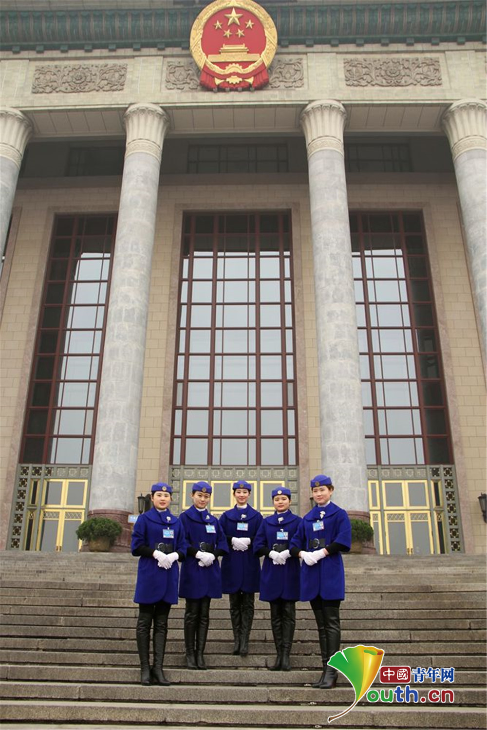 在人民大会堂前合影留念。中国青年网记者李延兵 摄