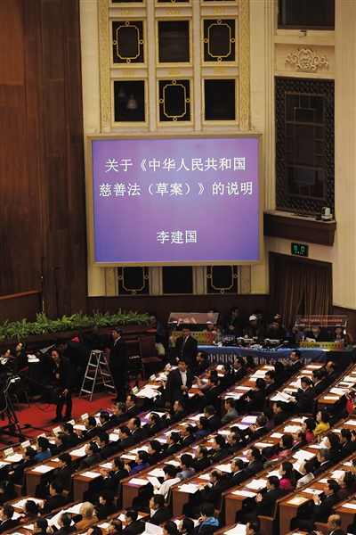 昨日,十二届全国人大四次会议举行第二次全体会议,听取全国人大常委会副委员长李建国关于慈善法草案的说明。新京报记者 侯少卿 摄