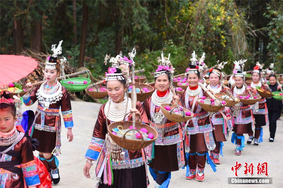 3月9日,“侗族大歌”的发源地广西三江侗族自治县梅林乡举办“二月二”侗族大歌节,演绎侗族民俗送新生满月儿回外婆家。当天,一位撑着红色油纸伞的侗族女孩背着一个满月的新生儿,后面跟着约百人、挑着酸肉、酸鱼、糯米、鸡蛋、酒等礼品的队伍。按照侗族当地习俗,婴儿满月当天,婆媳要带着孩子回外婆家,祈盼孩子健康成长。龚普康 摄