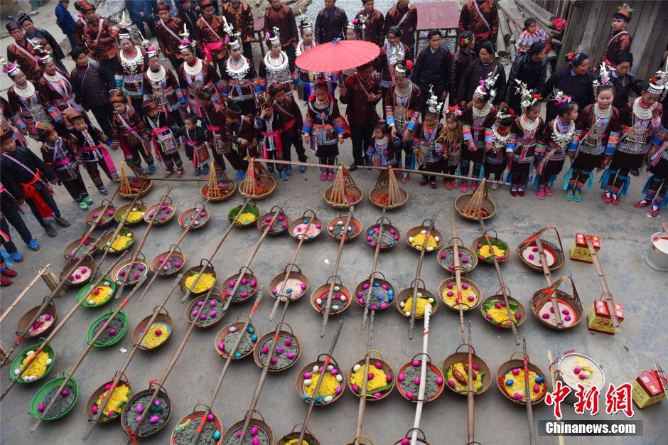3月9日,“侗族大歌”的发源地广西三江侗族自治县梅林乡举办“二月二”侗族大歌节,演绎侗族民俗送新生满月儿回外婆家。当天,一位撑着红色油纸伞的侗族女孩背着一个满月的新生儿,后面跟着约百人、挑着酸肉、酸鱼、糯米、鸡蛋、酒等礼品的队伍。按照侗族当地习俗,婴儿满月当天,婆媳要带着孩子回外婆家,祈盼孩子健康成长。龚普康 摄
