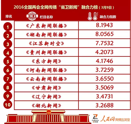 日前,由“人民网-泽传媒”共同打造的2016全国两会全网传播“省卫新闻”融合力榜单第8期出炉。截至3月10日12时,在全国36家省级上星频道3月9日晚所播联播中,《广东新闻联播》以融合力指数8.1943再度夺得“2016全国两会全网传播‘省卫新闻’融合力榜”冠军,《湖南新闻联播》以8.0565位居亚军,《江苏新时空》以7.7532位列第三。据“人民网-泽传媒”连续8期大数据全媒体统计显示,上述三家联播在两会前半程报道阶段保持全媒体传播的相对优势。《贵州新闻联播》《河南新闻联播》《甘肃新闻》均有提升,分列于第四、第六和第八。值得一提的是,《东方新闻》已连续数日稳居五强。