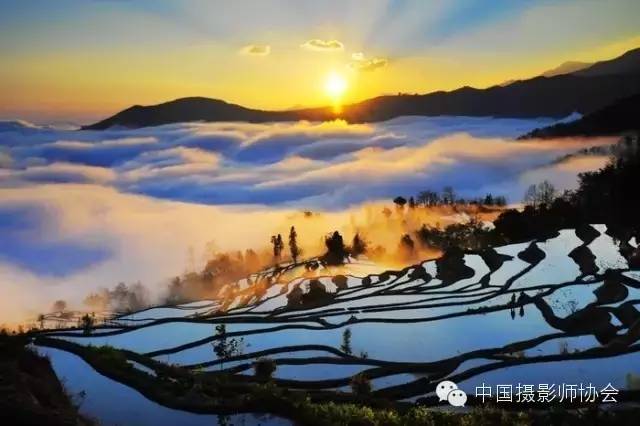 当太阳呈逆光角度驱散晨雾,层层梯田便渐渐染上金光,坐落其间的哈尼族彝族山寨,被云雾掩映得扑朔迷离,如诗如画,如梦如幻。