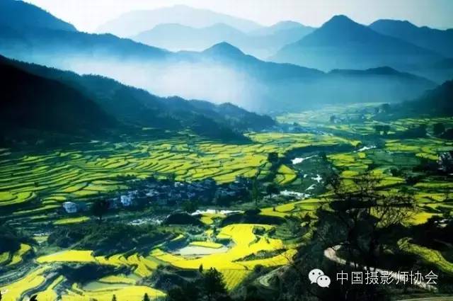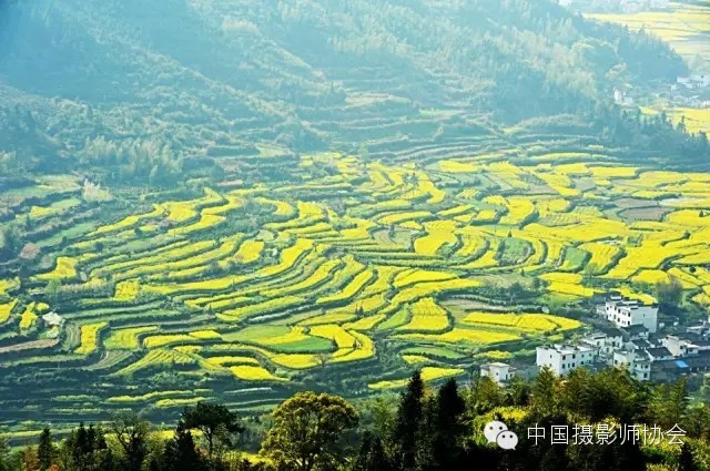 三月金灿灿的油菜花遍布田野,从山顶铺散到山谷下,油菜花层层叠叠,一望无。