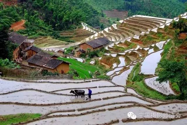 在早上,披着霞光晨耕的农夫唱着山歌,吆吼着水牛,在金光灿灿的梯田中耙耕……此情此景,用任何语言描写都显得苍白无力。