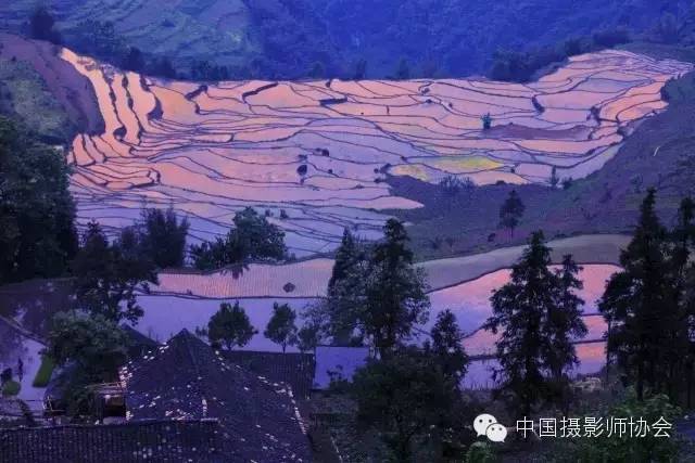 在斜阳和彩霞的映照下,连片的梯田就像是浩瀚的大海,雄伟壮丽,各种有节奏的层次和美妙曲线,五彩斑斓的颜色搭配,常让人目瞪口呆,不知身在何处。