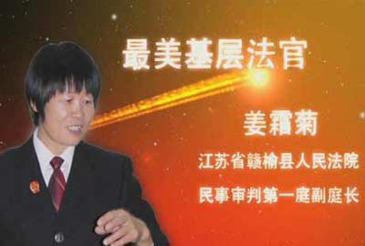 姜霜菊,赣榆县人民法院民一庭副庭长。从事审判工作30年来,她始终以党和人民的利益为重,坚持能动司法,忠实履行法律赋予的神圣职责。近10年来,她共审理各类案件5000多件,平均每年办理案件近600件,案件撤诉率达81%,上诉率仅为0.85%,所办案件无一错案,无一当事人上访,无一当事人申诉。