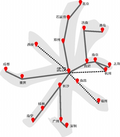 完善武汉至周边中心城市的放射状、大能力、高标准通路,重点推进武汉至郑州北京、南京上海、杭州、东南福州、长沙广州、重庆成都、西安西北七个方向的高铁建设
